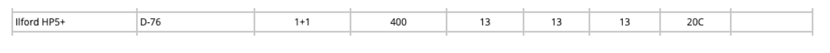위표는 일포드 hp5+ 필름과 코닥 d-76 현상약품을 선택해서 나온 쉬트입니다.