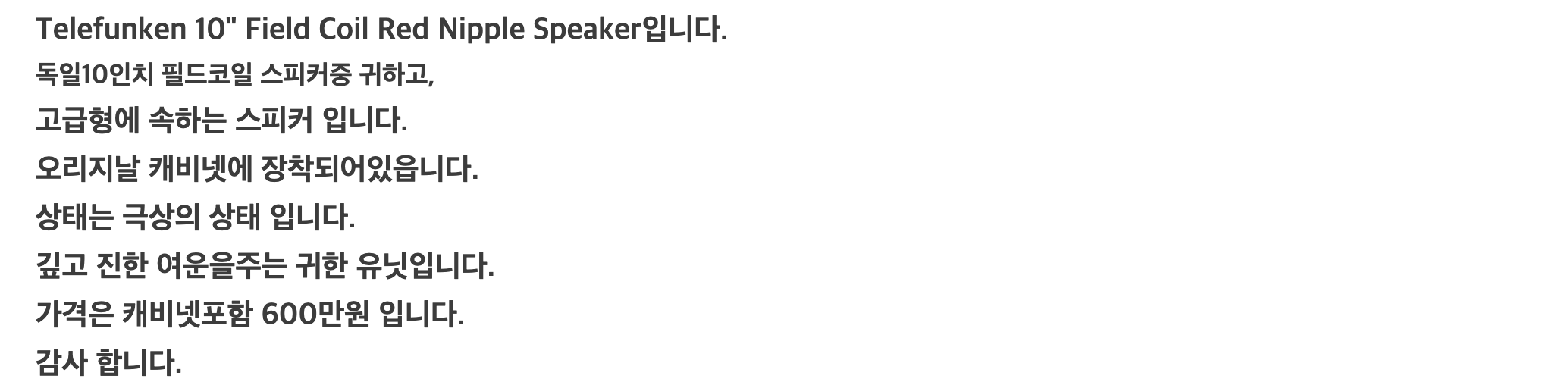 Telefunken 10" Field Coil Red Nipple Speaker입니다. 독일10인치 필드코일 스피커중 귀하고, 고급형에 속하는 스피커 입니다. 오리지날 캐비넷에 장착되어있읍니다. 상태는 극상의 상태 입니다. 깊고 진한