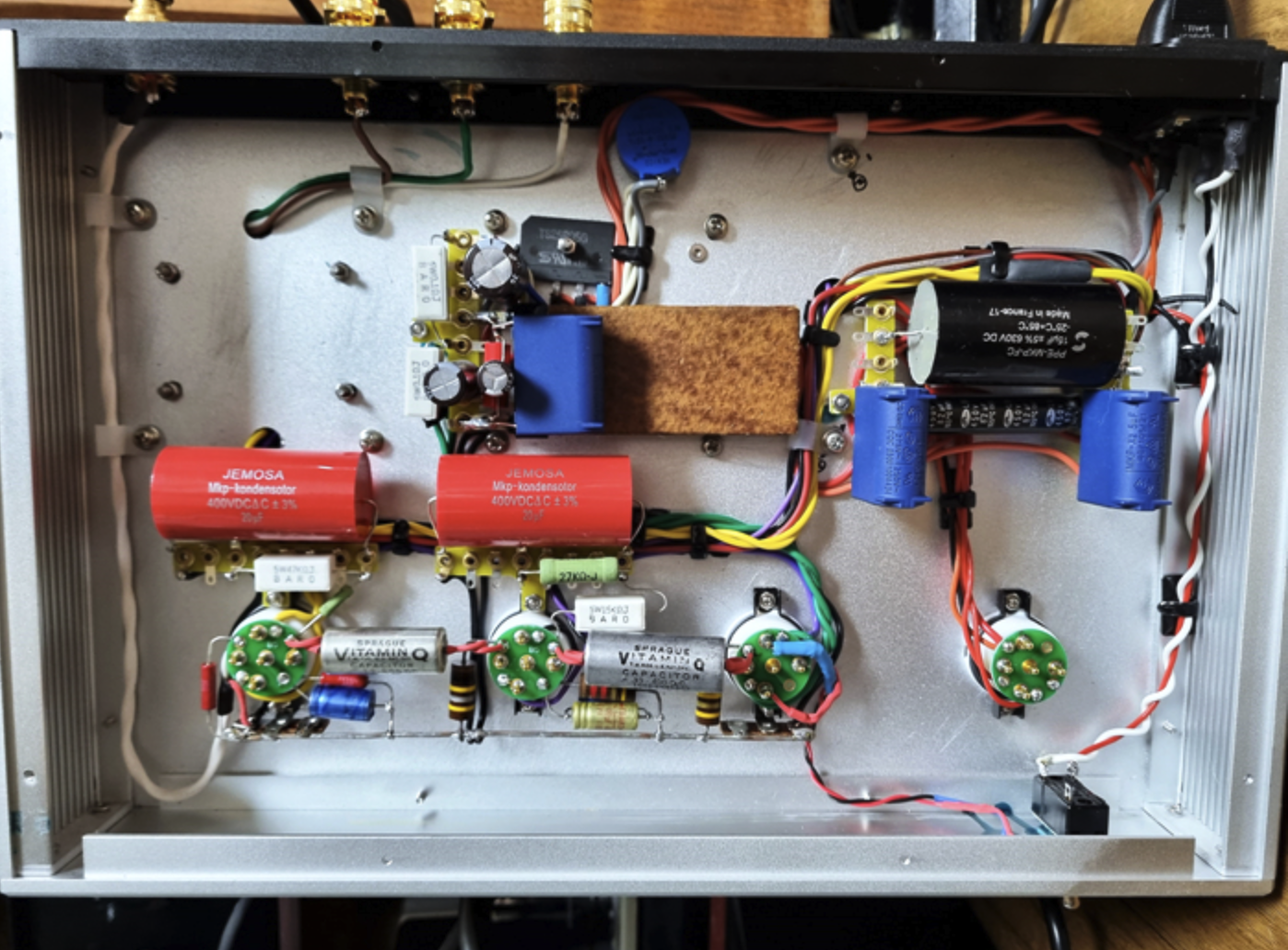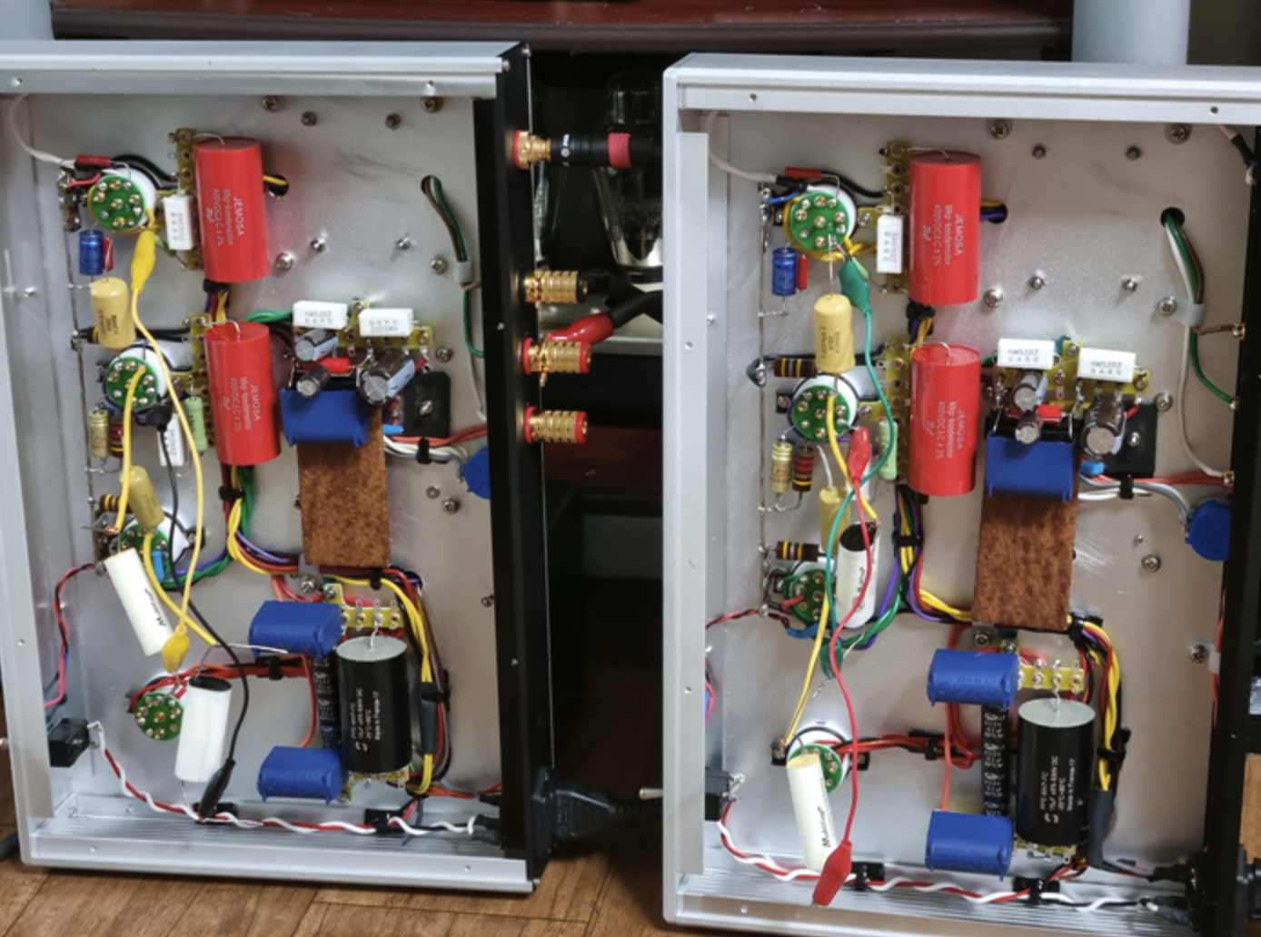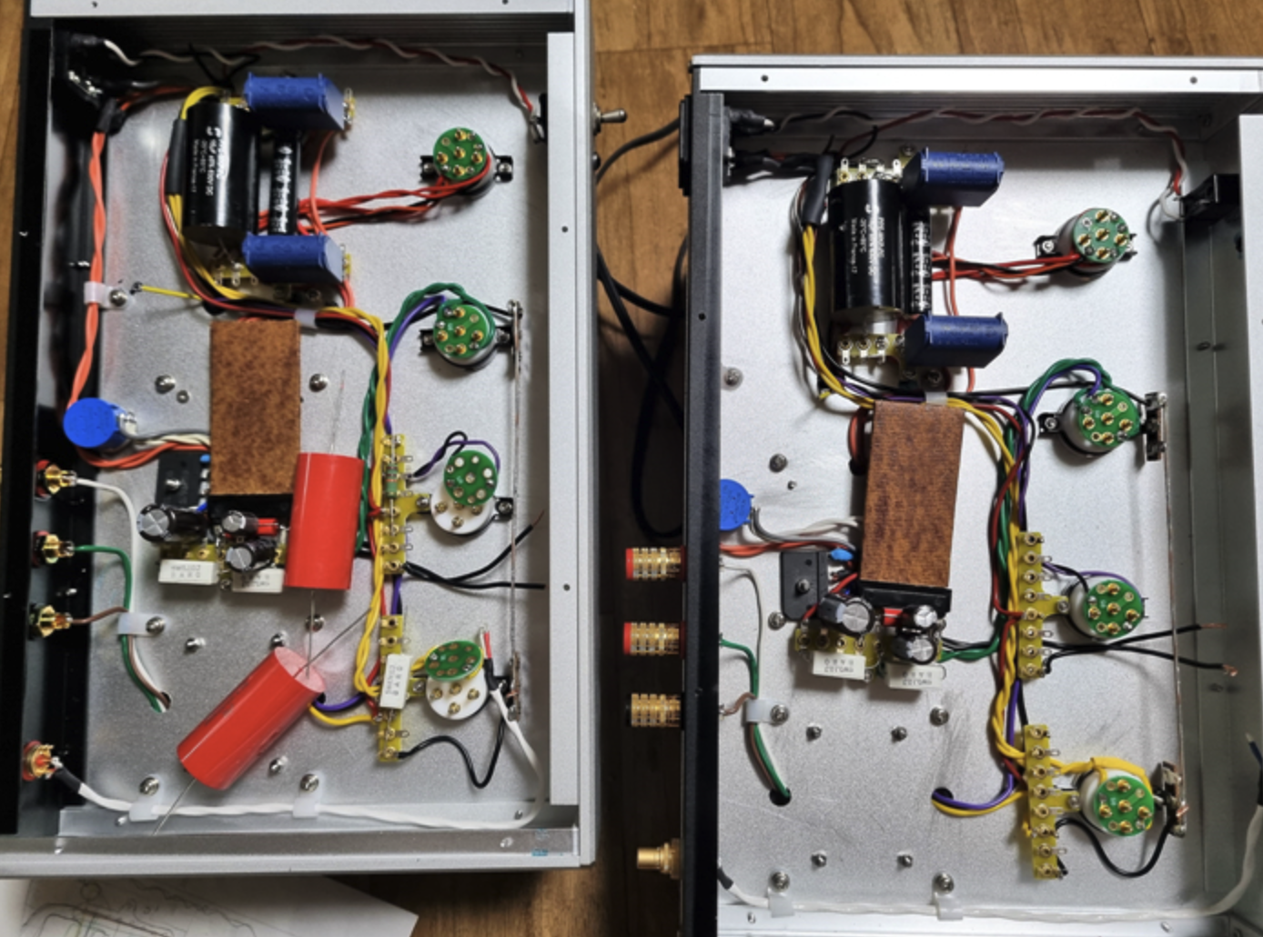 게다가 초단 캐소드 바이패스 콘덴서는 좌우측 앰프에 외형은 비슷하나 서로 다른 회사의 콘덴서를 달아 놓았습니다.