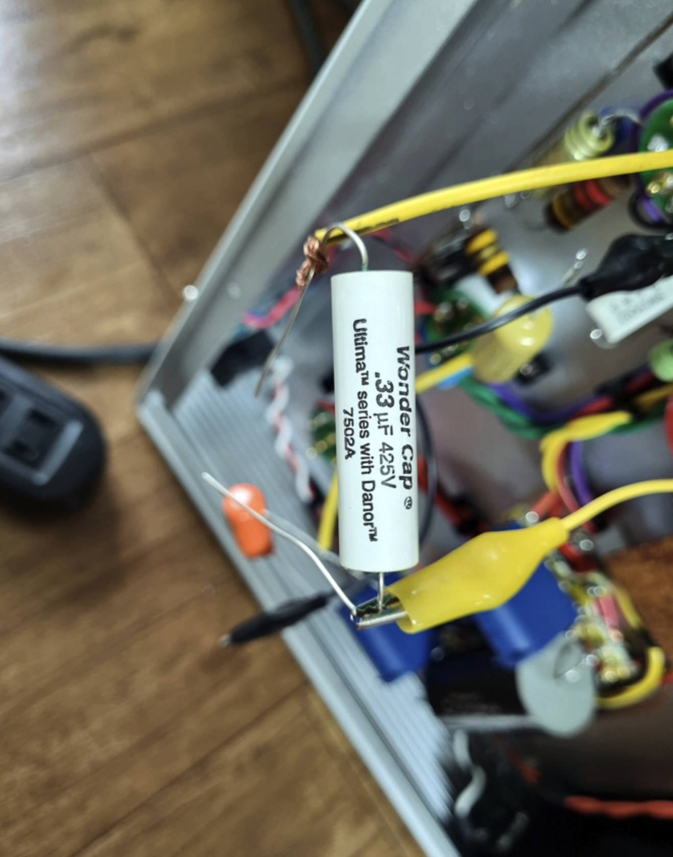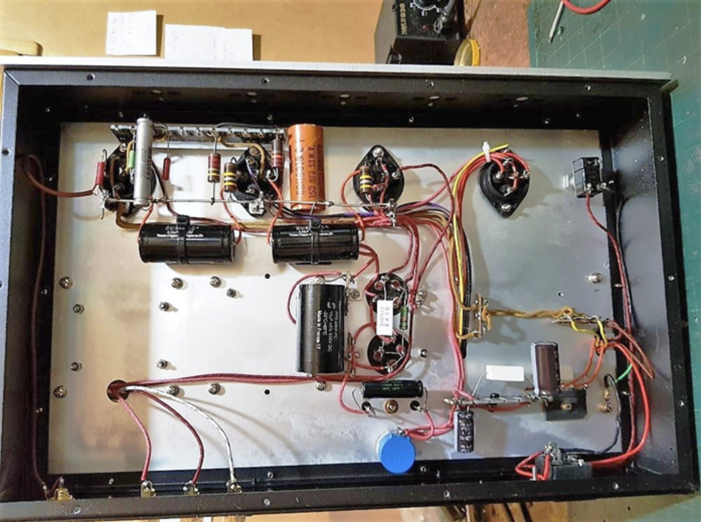 해체후, 드라이브 단에 사용된 캐소드 바이패스 콘덴서(누런 종이 캡으로 싸여있는 생산된지 60~70년 지난 전해 콘덴서)를 측정해보니