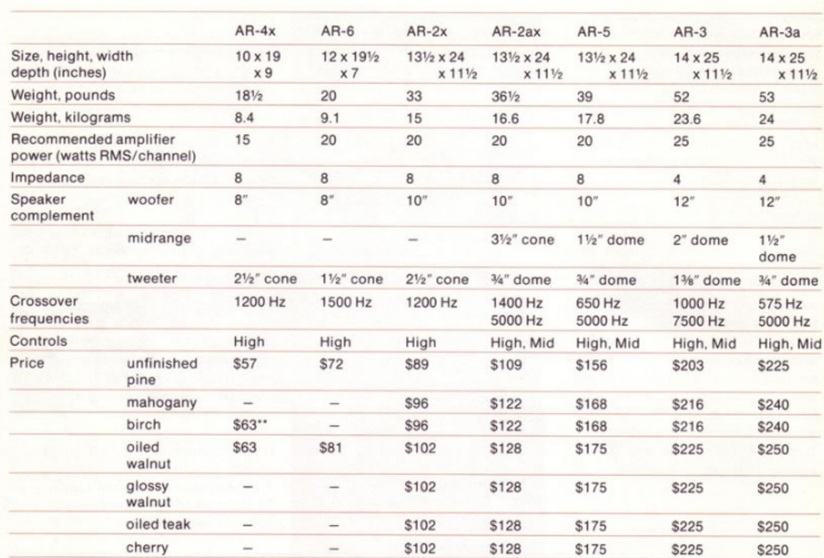 - AR4XA : 1973년 발매 / 1.25 Cone 트위터, 8인치 우퍼 / 크로스오버 1.6Khz