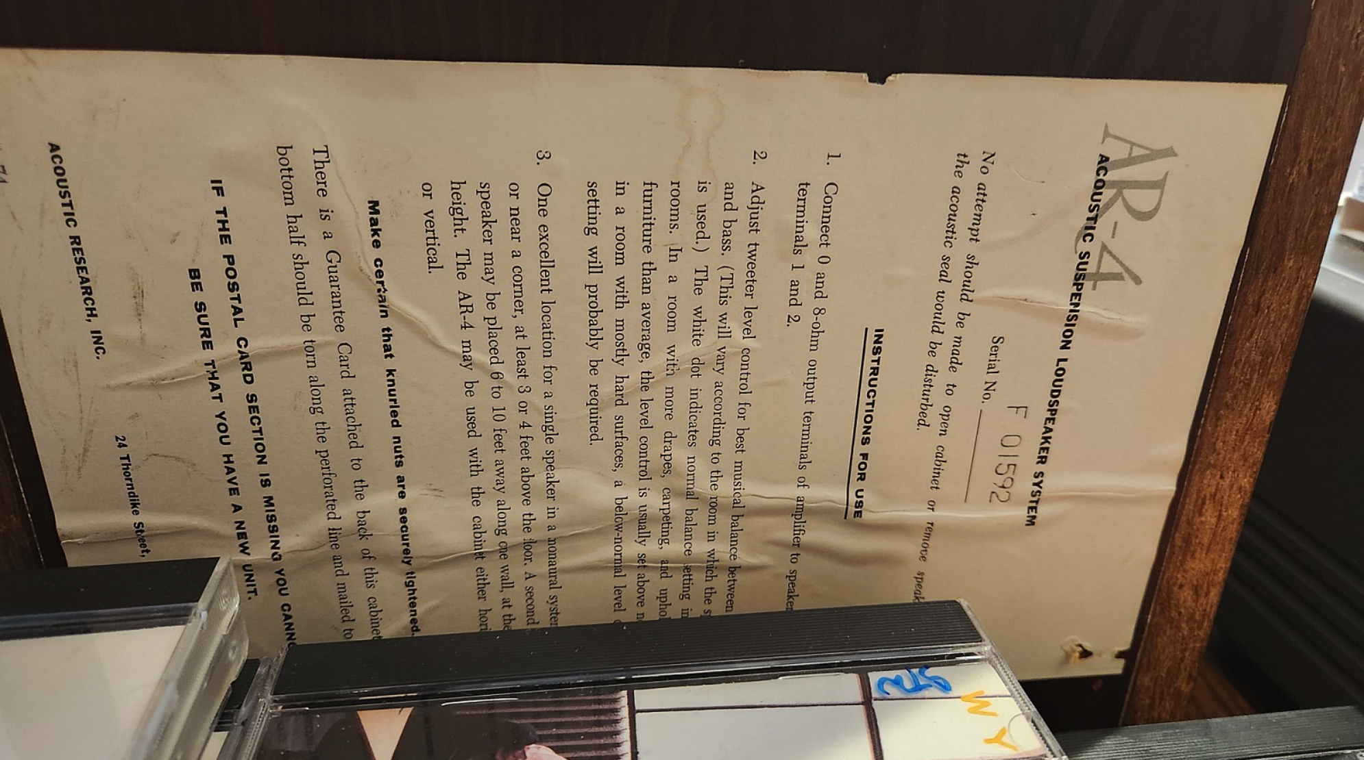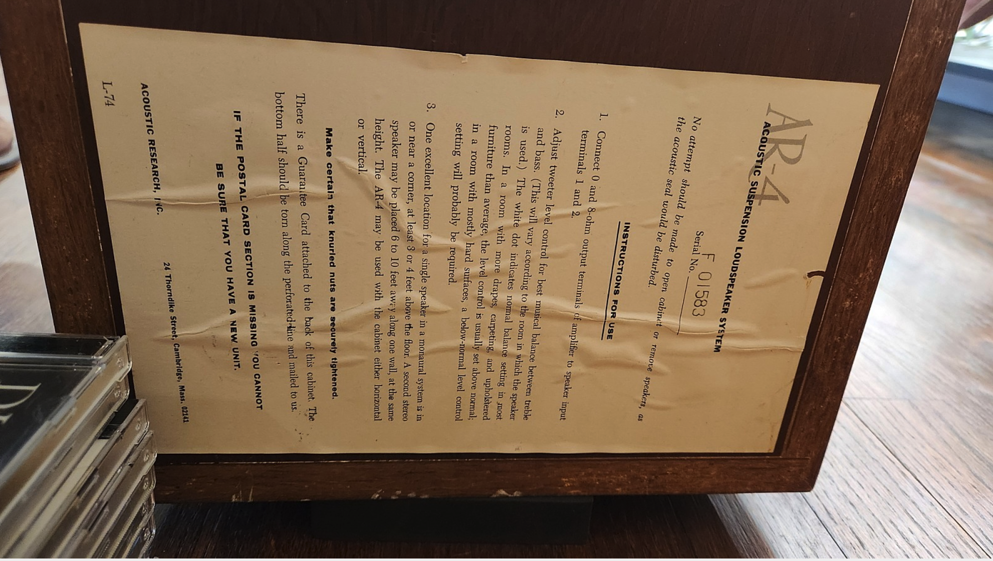 - AR4X : 1965년 발매 / 2.5인치 Cone, 8인치 우퍼 / 크로스오버 1.6Khz --> 1.2Khz로 225,000번부터 변경