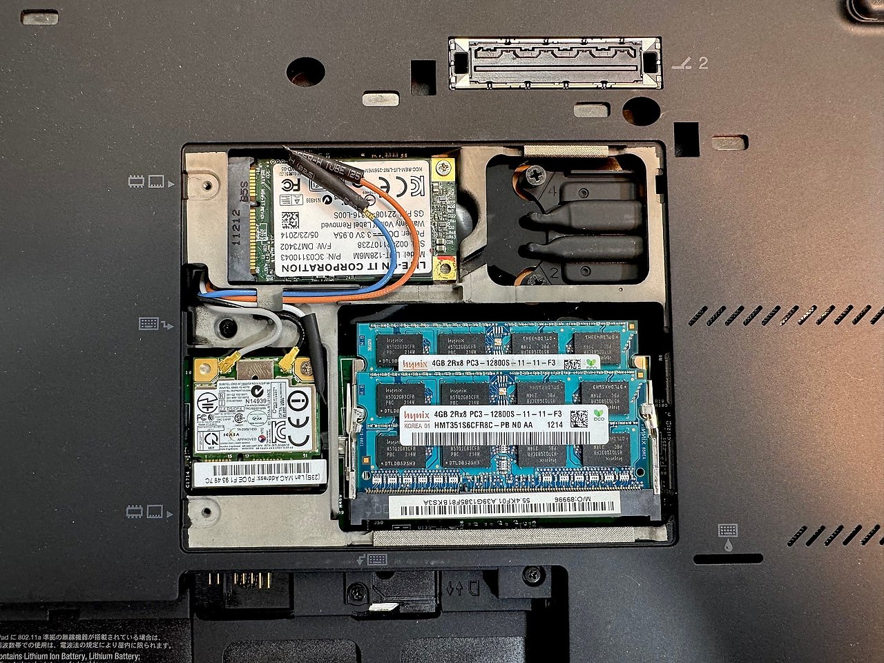 장착되어 있던 삼성 4기가 램을 탈거하고 갖고 있던 하이닉스 4기가 램 2개를 장착해서 8기가로 랩을 업그레이드해주고, 비워있던 슬롯에 x230에서 탈거해 놓은 128기가짜리 mSATA ssd를 장착했습니다.